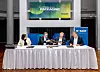 Vertragsunterzeichnung: Tülin Ersari (VP Controlling und Strategie für Europäische Verbundstandorte bei BASF), Helmut Winterling (President Europäische Verbundstandorte bei BASF), Oliver Helling (Sales Director EMEA & Head of Global KAM bei Schütz), Veit Enders (Mitglied der Geschäftsführung der Schütz-Gruppe), v.l.